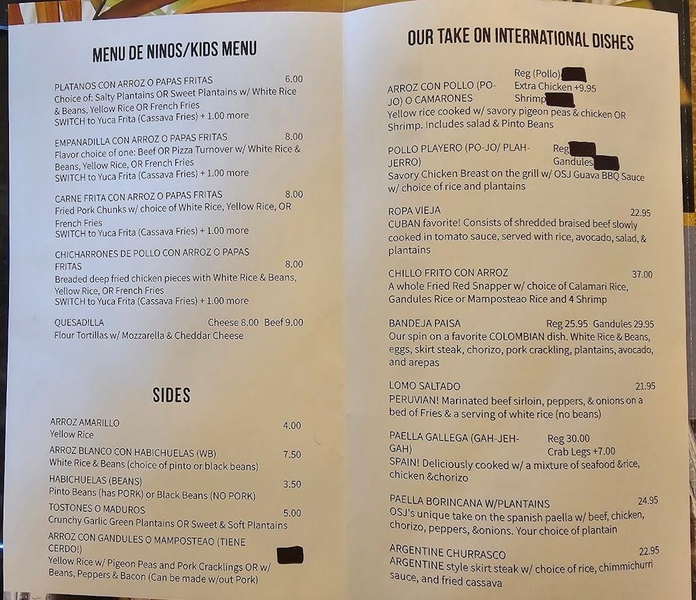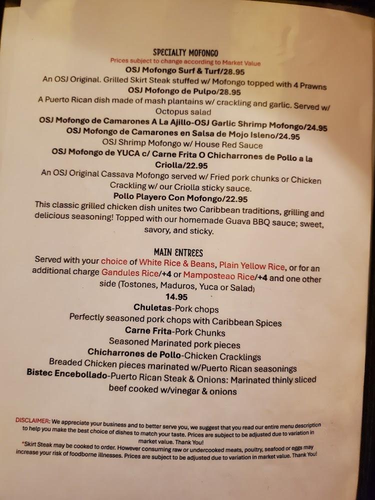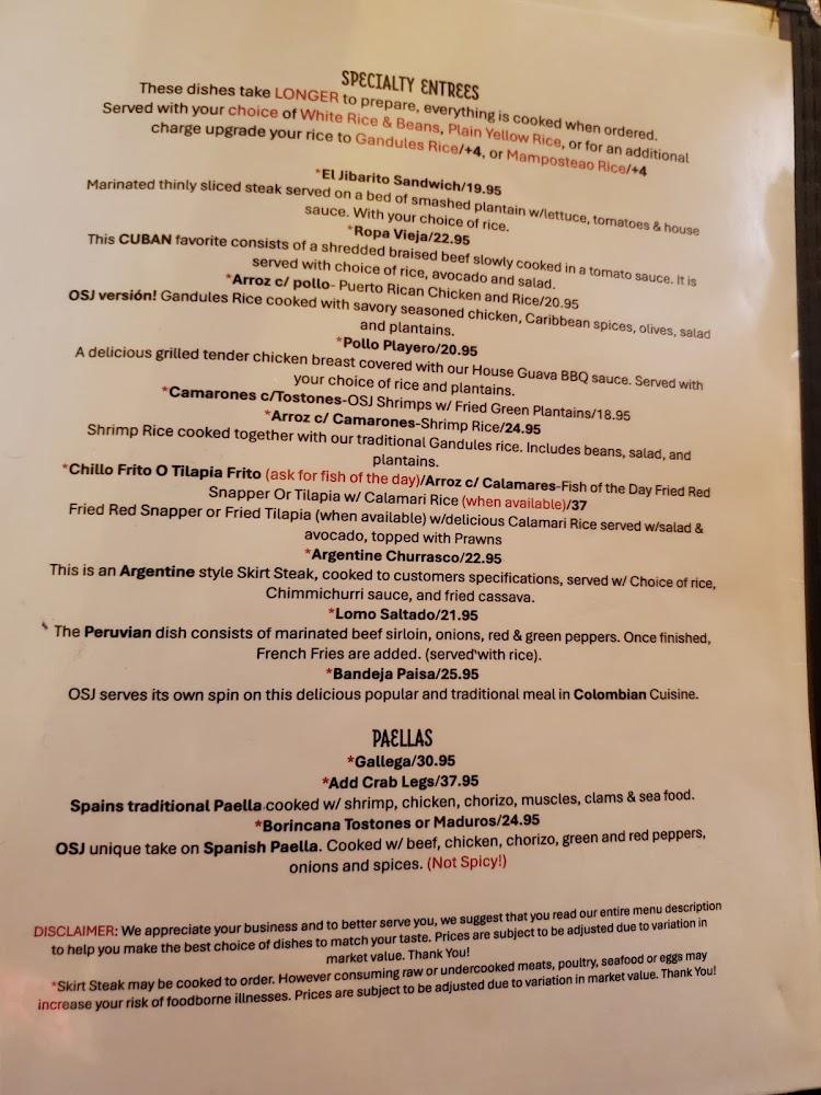 OSJ International Restaurant showcases a menu rich in Puerto Rican flavors and traditional dishes. Signature items include Mofongo, the restaurant's star, and Bandeja Paisa, perfect for sharing. Each dish is crafted with authentic ingredients. You can expect to find a variety of appetizers such as patacones, ideal for beginning your meal. Their paellas are renowned, blending seafood and spices to create a truly comforting experience. The abundance of vegetarian options means everyone can enjoy a meal here. Desserts like flan are recommended to round off your dining experience. Prices range from $20 to $30, making it accessible for both lunch and dinner. With dishes designed for sharing, you can easily indulge in multiple flavors in one visit.